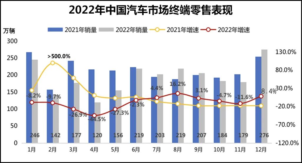 2022年,在国内宏观经济下行、二次疫情反复,国际芯片短缺延续、油价和原材料价格高涨等多重负面因素冲击下,中国汽车行业面临前所未有的下行压力,全年终端零售2328.4万辆,同比2021年下降8.9%,销量规模创2015年以来最低水平,市场尽显疲软态势。