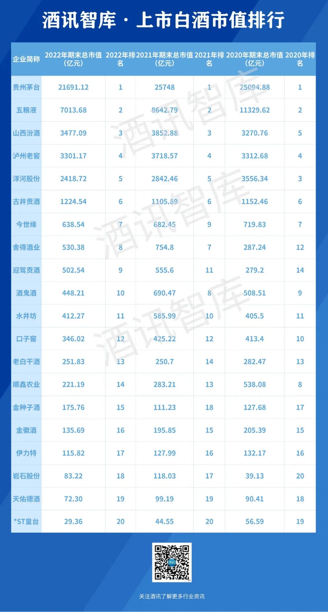 酒讯智库针对2022年(2021年12月31日至2022年12月30日)的白酒股市值表现进行梳理,从市值变动、股价涨跌纬度,观察白酒股这一年的成长情况,制作了“2022白酒股市值增长榜”,以市值增长情况一窥白酒股的价值。