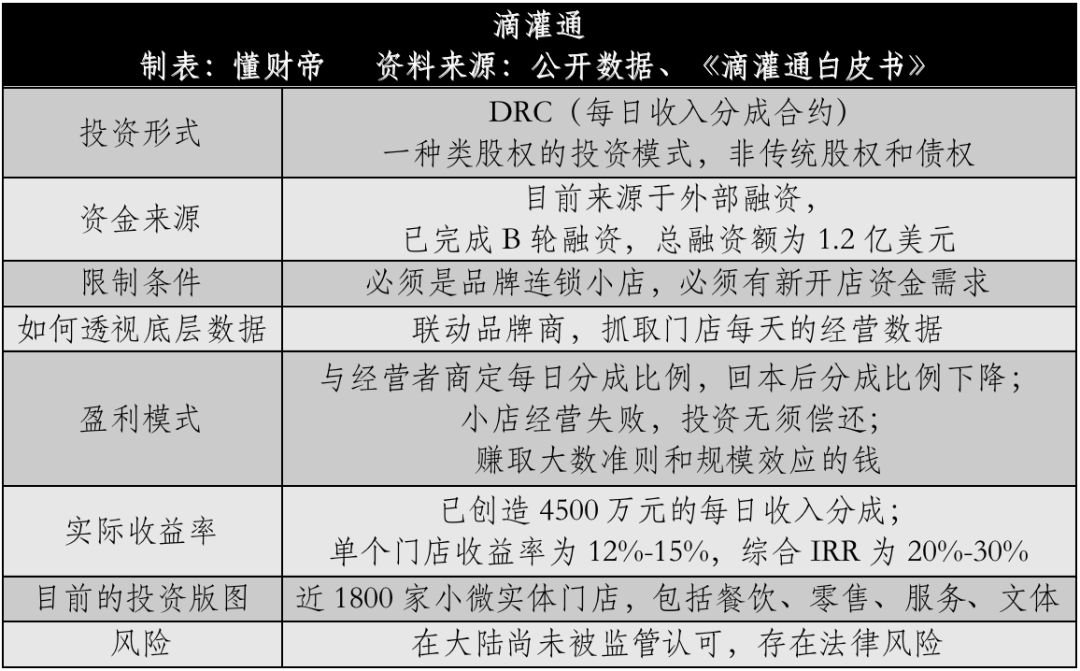 实际收益率方面,据《滴灌通白皮书》披露,目前已创造4500万元的每日收入分成,单个门店收益率为12%-15%,综合IRR为20%-30%。