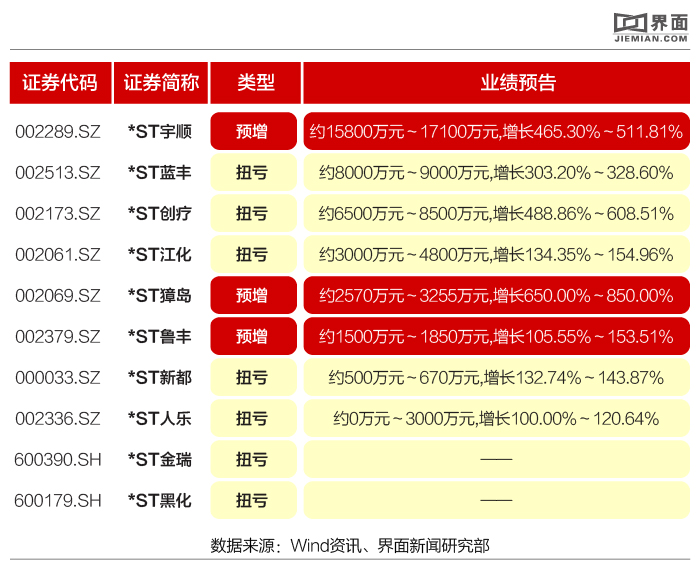 随着经营面的改善,不少*ST股三季度业绩迎来暴增,这大大增加了保壳概率。除*ST蓝丰外,*ST创疗(002173.SZ)也因新收购标的资产较好的盈利能力,预计于今年前9月实现净利润6500万-8500万元,同比增长488.85%-608.51%。*ST江化(002061.SZ)则因在报告期内,公司产品和原材料价格剪刀差扩大,对公司业绩提升具有积极作用。同时,该公司重组的浙铁大风实现资产过户,可提升盈利水平。*ST獐岛(002069.SZ)则受益于海洋牧场资源恢复、虾夷扇贝价格上涨以及国际市场订单的增加,使得主营业务盈利能力持续改善。公司预计今年前9月的净利润为2570.03万-3255.37万元,同比增长650%-850%。