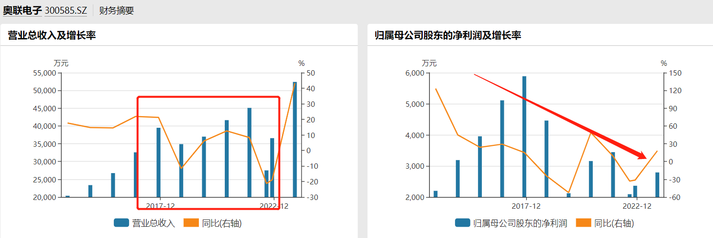 奥联电子原以汽车动力电子控制零部件为主要发展方向。虽然公司产品在多个细分领域拥有较强市场竞争力,客户众多并且具有一定知名度,包括上汽、吉利、一汽、等传统车企,同时也已进入零跑、哪吒、小米、蔚来、理想、东风岚图等新能源汽车供应商体系。不过根据WIND数据显示,奥联电子营收自2017年起就进入了一个长期瓶颈,净利润更是逐年下滑。