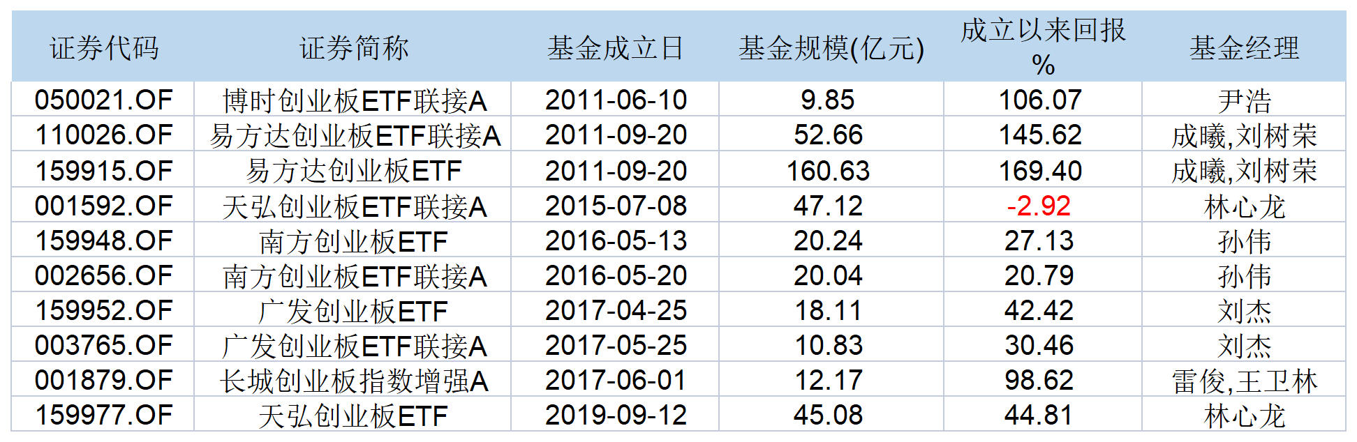 从规模来看,44只创业板指数产品分化较大,规模在2亿元以下的有23只。其中规模最大的是易方达创业板ETF,成立于2011年9月20日,截至去年三季度末规模为169.4亿元,最新的规模为208.78亿元。与之相应的,该ETF的联接基金规模也达到了52.66亿元。