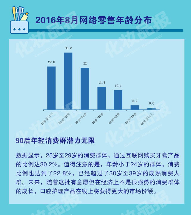 数据显示,25岁至29岁的消费群体,通过互联网购买牙膏产品的比例达30.2%。值得注意的是,年龄小于24岁的群体,消费比例也达到了22.38%,已经超过了30岁至39岁的成熟消费人群。