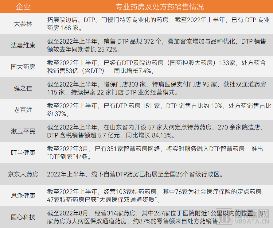 部分零售企业的专业药房经营情况,资料来源:公司招股书和财报