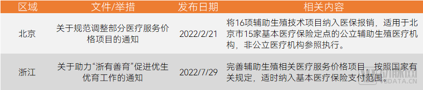 2022年,国家卫健委、国家医保局等17部门《关于进一步完善和落实积极生育支持措施的指导意见》提出,指导地方综合考虑医保(含生育保险)基金可承受能力、相关技术规范性等因素,逐步将适宜的分娩镇痛和辅助生殖技术项目按程序纳入基金支付范围。各地在辅助生殖支付方面也有一定的政策突破。