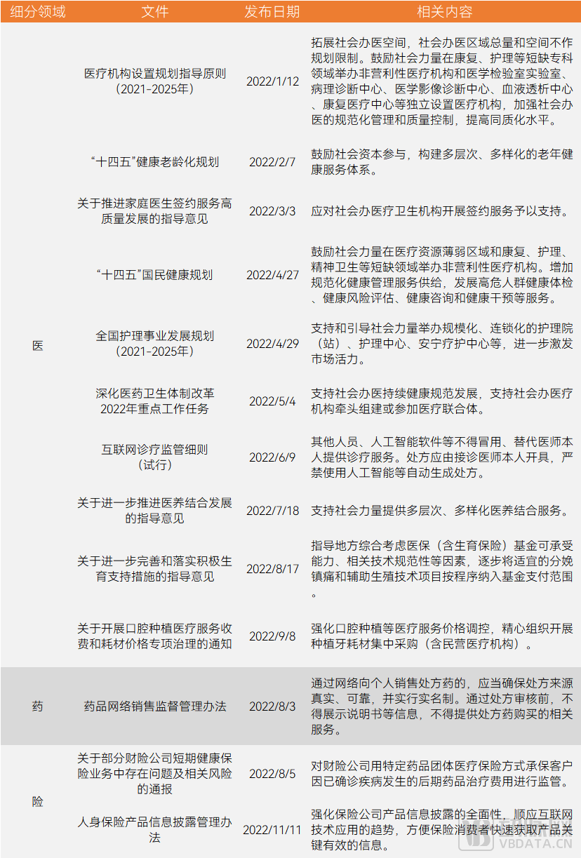 此外,政策还针对互联网诊疗、医药电商、商业健康险等的规范服务、健康发展提出了更高要求。