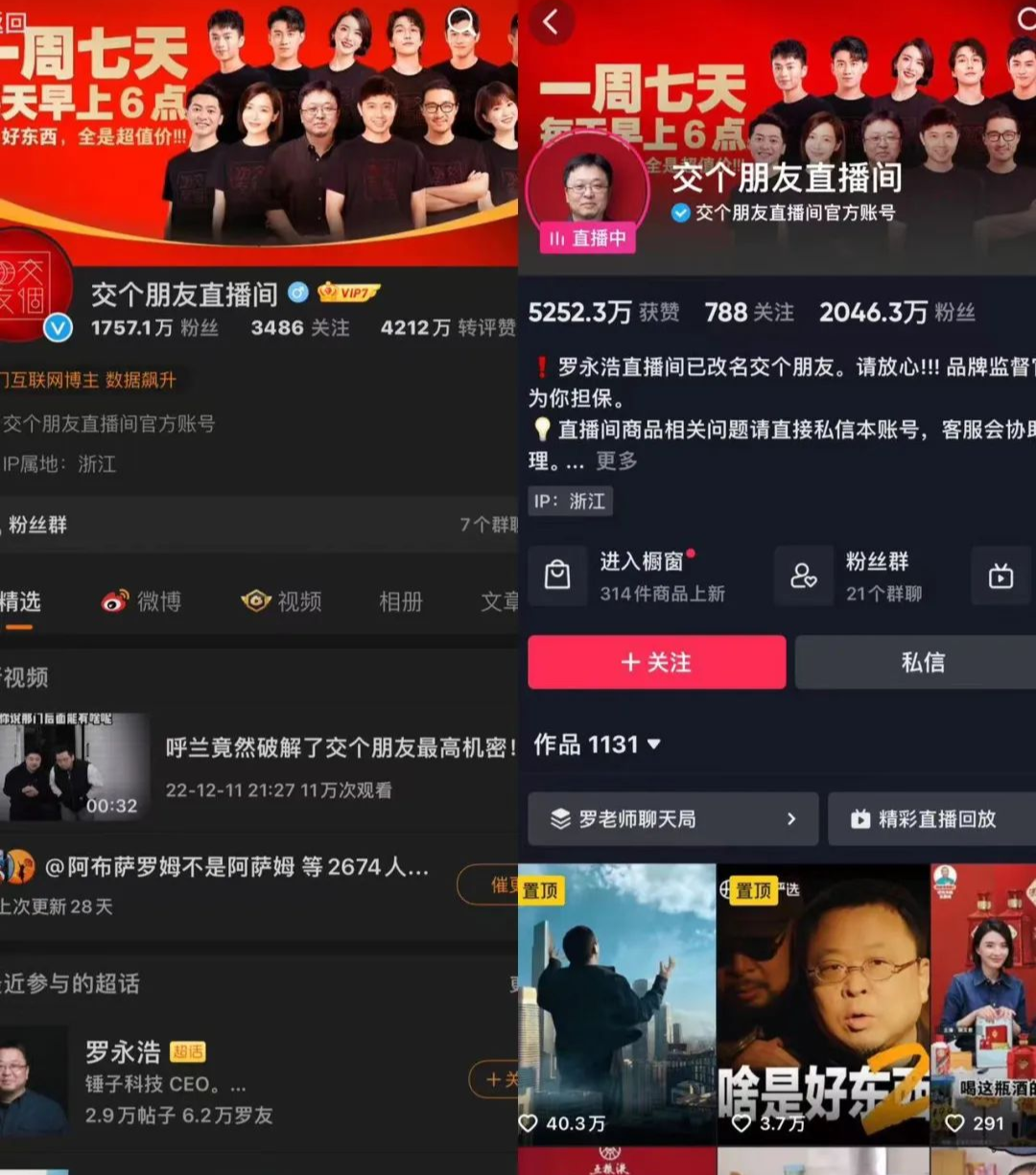 随后数日间,社交平台罗永浩相关个人账户均更名为“交个朋友”。