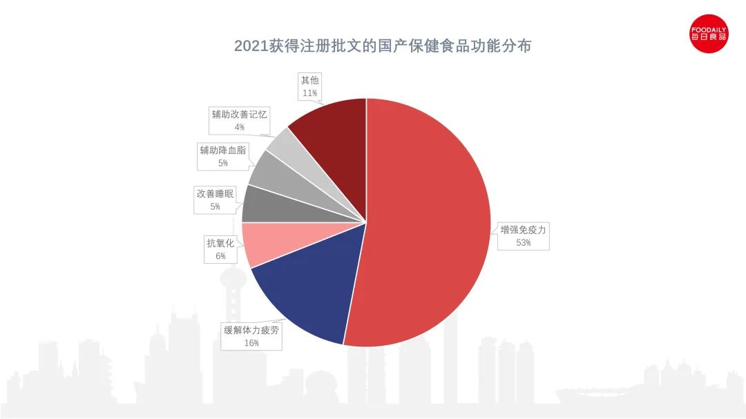 同时,作为亚洲健康食品市场的风向标——日本,因疫情原因促使国民健康意识的进一步提高,日本消费者对功能性食品的需求也大大增加:根据日本矢野经济研究所《2022年版健康食品市场实态及展望市场分析篇》的调查显示,2020年度日本功能性食品的市场规模同比增长19.7%,达到了3044亿日元,据富士经济株式会社调查数据显示,随着国民免疫需求的提升,日本具有免疫维持的功能性的产品市场规模将在2022年扩大至125亿日元,预计同比增长约7.4倍。