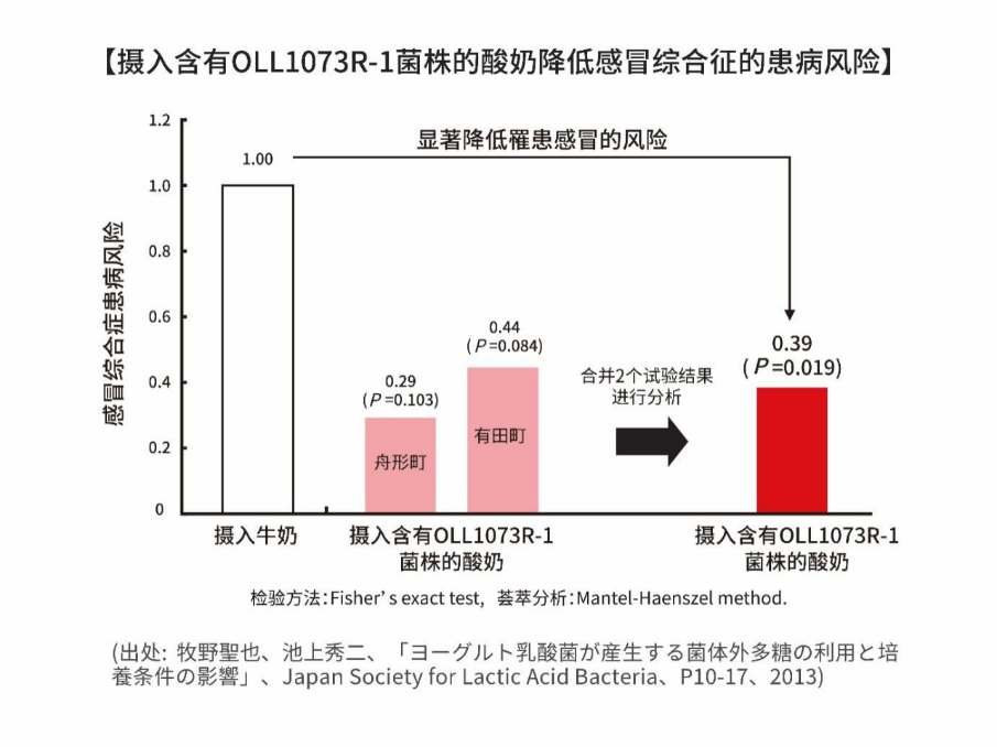 日本的研究团队则对居住在山形县舟形町的40岁以上的居民,以及居住在佐贺县有田町的60岁以上的健康老人进行含有OLL1073R-1菌株酸奶的摄取组和牛奶摄取组对比实验,山形县舟形町的摄取时间为8周,佐贺县有田町摄取时间为12周。最终结果表明,干预组与对照组相比,患感冒、流行性感冒等感冒综合征的风险显著降低。