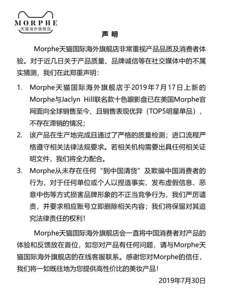 7月30日,Morphe品牌方曾发表声明表示:1)“该眼影盘在国外销量不错,属于前5的销量”;2)“质检合格”;3)“没有到中国清货”