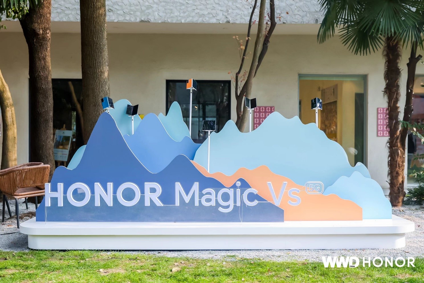艺术交互装置《凤鸟展翼》的设计灵感来自HONOR Talents获奖作品《共鸣》。创作者采用了中国传统山水画的表现形式,让荣耀折叠屏手机Magic Vs化身凤鸟,以翱翔山水之间的自由姿态,展现人与自然的和谐共生,也希望能引起参观者对回归本真生活的共鸣。