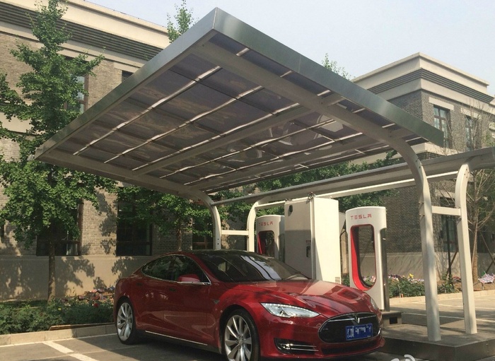 特斯拉电动汽车的最初理念就是提倡环保、节能。为了完全做到这一点,太阳能光伏与充电桩的完美结合是必不可少的。特斯拉汽车充电通过充电站顶棚或者周边建筑的屋顶光伏电站来完成。目前,特斯拉已开始在全球范围内建造光伏超级充电站,通过“光伏-储能-充电”的方式,对太阳能转换而来的电力进行储存,并有望对特斯拉提供24小时不间断的太阳能充电。