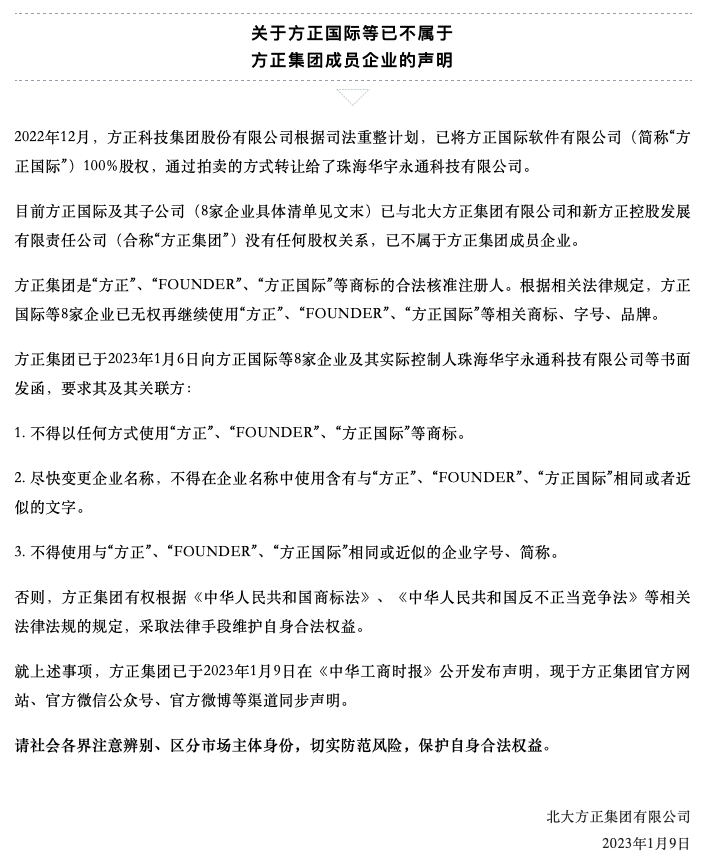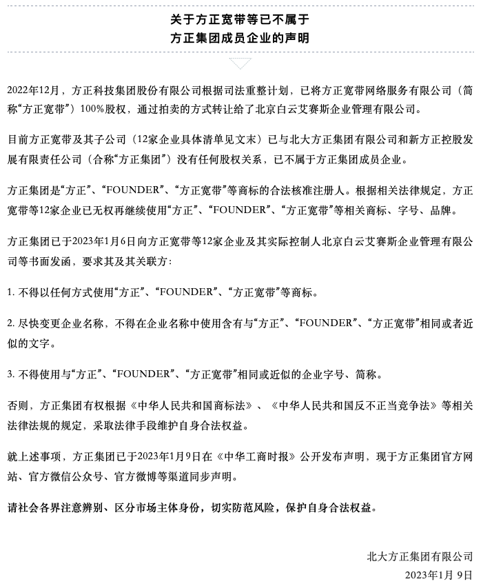1月9日,北大方正集团有限公司发布声明称,2022年12月,方正科技集团股份有限公司根据司法重整计划,已将方正宽带网络服务有限公司(简称“方正宽带”)100%股权,通过拍卖的方式转让给了北京白云艾赛斯企业管理有限公司;已将方正国际软件有限公司(简称“方正国际”)100%股权,通过拍卖的方式转让给了珠海华宇永通科技有限公司。目前方正宽带及其子公司、方正国际及其子公司已与北大方正集团有限公司和新方正控股发展有限责任公司(合称“方正集团”)没有任何股权关系,已不属于方正集团成员企业。