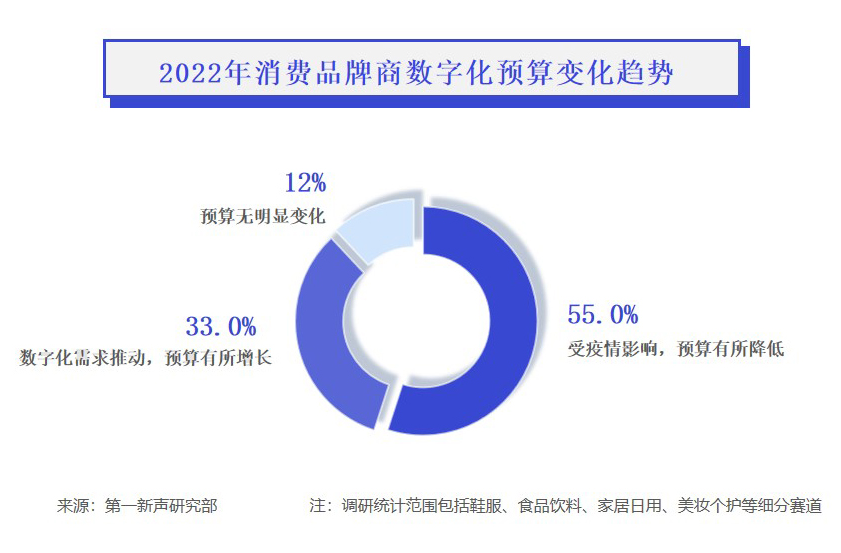 此外,针对营销方面,第一新声曾调研了近百家消费品牌商及数字化服务商发现,目前55%的消费品牌商2022年数字化方面预算对比上年有所降低,33%的企业预算有所增长,12%的企业无明显变化。