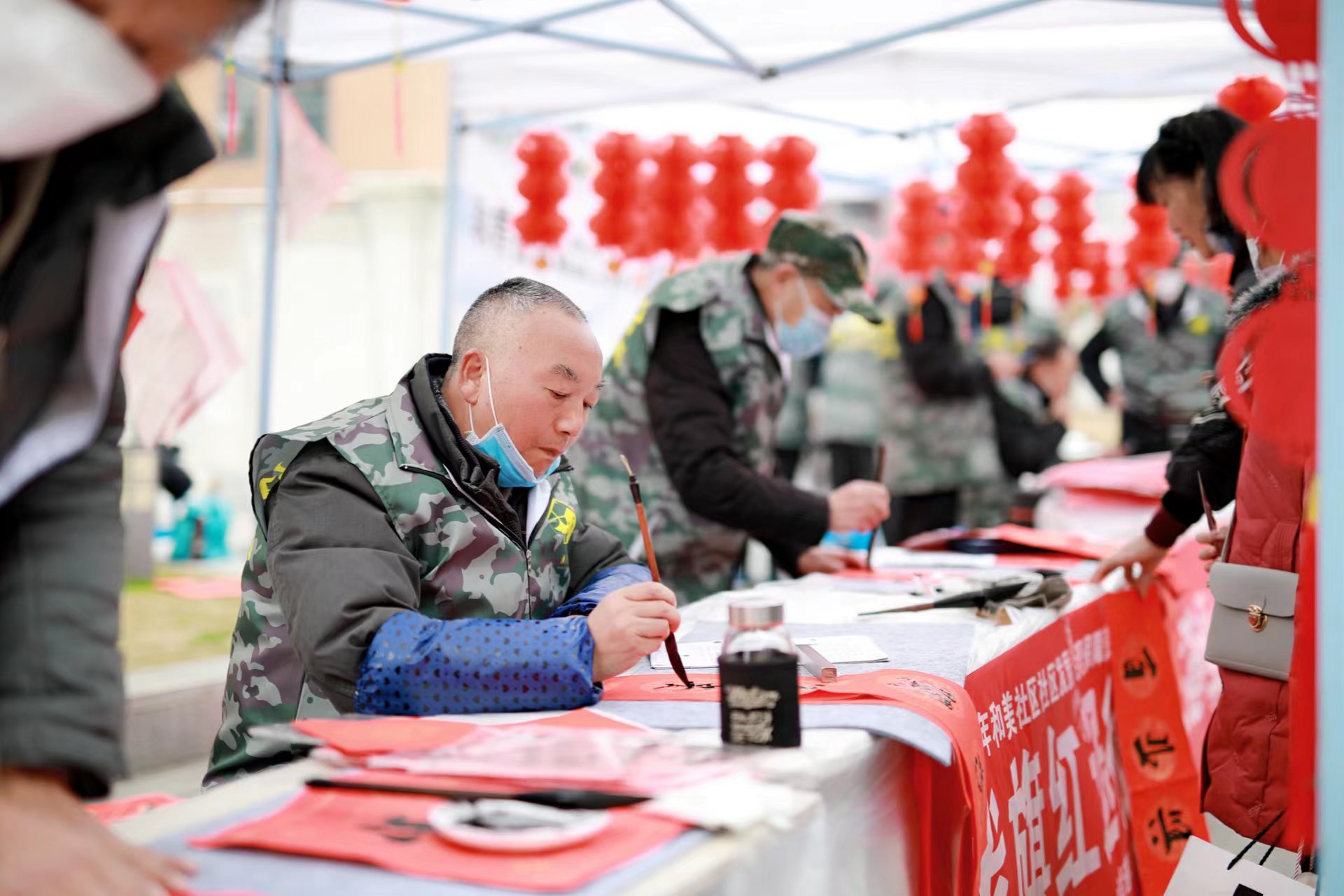 战旗红退役军人在活动现场铺纸研墨,笔酣墨饱,下笔如行云流水,一幅幅充满喜庆、吉祥的春联在他们手中随笔而出,居民们则可以自行挑选领取一幅幅寄托着美好心意和新春祝福的对联,在小小的互动中传递爱与希望。