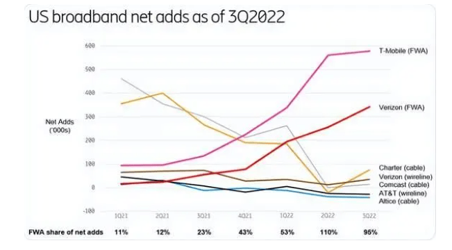 如在2022年第三季度,在美国前六大宽带服务提供商中,95%宽带用户净增量来自FWA,其中主要是T-Mobile和Verizon,这两家的FWA用户净增量达到92万户。