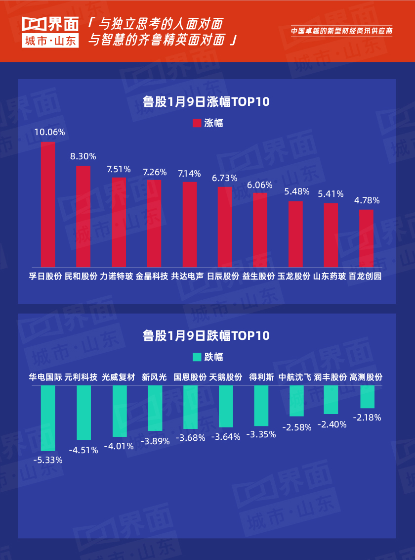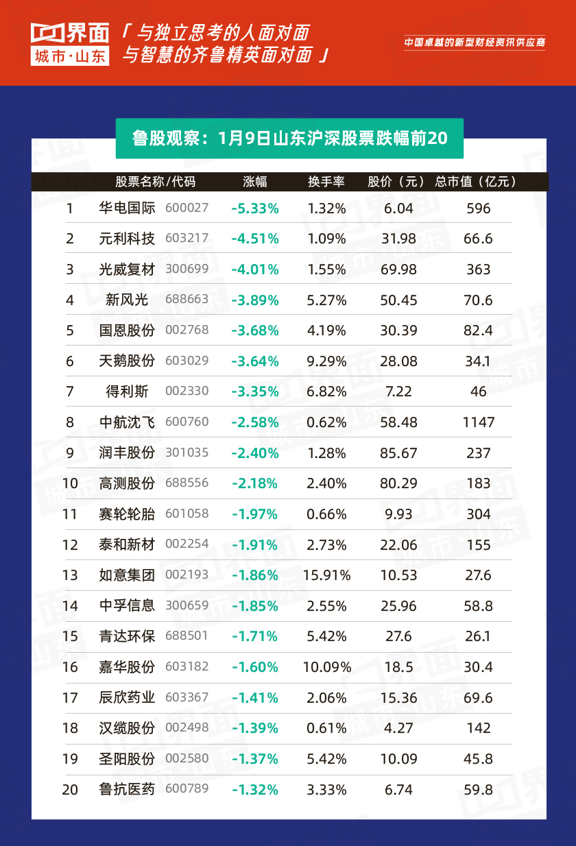1月9日,山东省内沪深股票有180只个股上涨,96只个股下跌;总市值过千亿的有万华化学(600309)、海尔智家(600690)、兖州煤业(600188)、青岛啤酒(600600)、中航沈飞(600760)共5家,500亿-1000亿的共有6家,分别是歌尔股份(002241)、潍柴动力(000338)、山东黄金(600547)、华鲁恒升(600426)、华熙生物(688363)、华电国际(600027)。