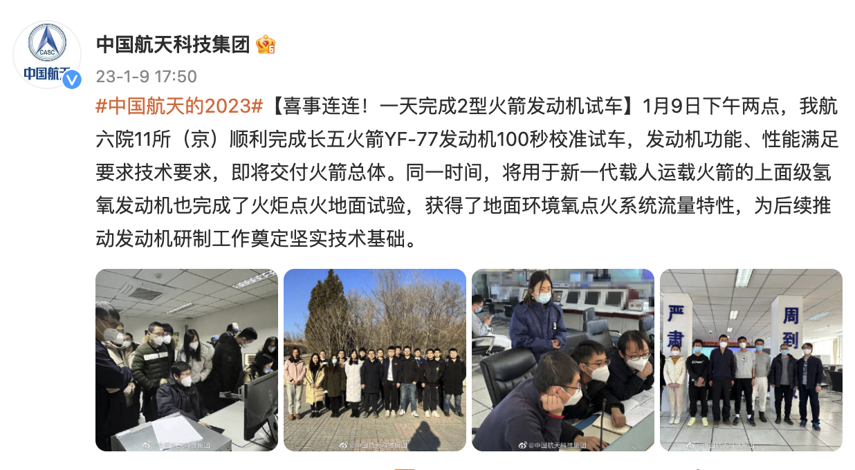 中国航天科技集团官博消息,1月9日下午两点,集团六院11所(京)顺利完成长五火箭YF-77发动机100秒校准试车,发动机功能、性能满足要求技术要求,即将交付火箭总体。同一时间,将用于新一代载人运载火箭的上面级氢氧发动机也完成了火炬点火地面试验,获得了地面环境氧点火系统流量特性。
