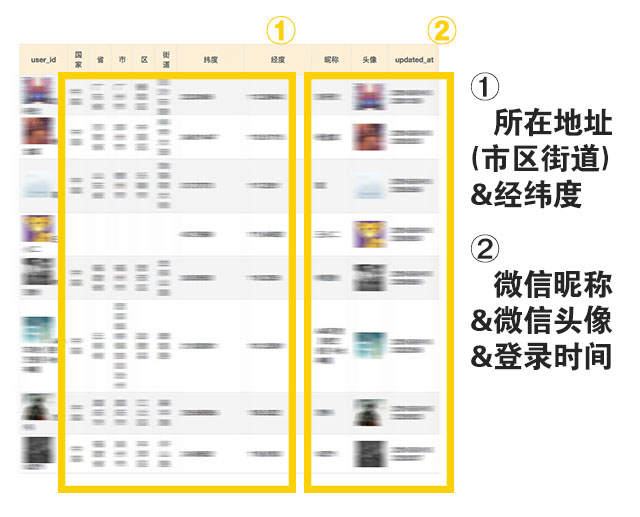 点击量很快上来了,很多人回应定位很准。但这并不是我的真正目的!电脑前的我开始不断刷新网页后台的数据库,查看从这个H5中收集到的数据——你没看错,打开H5的人所在地理位置(包括国家、省、市、区、街道、中心纬度、中心经度)都被记录和保存下来了,还对应微信头像和昵称。