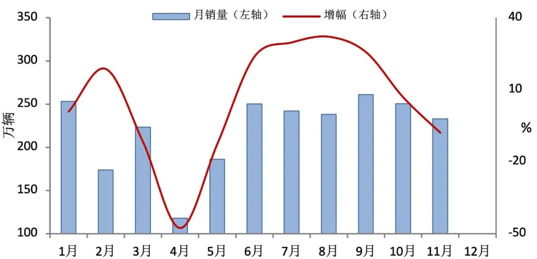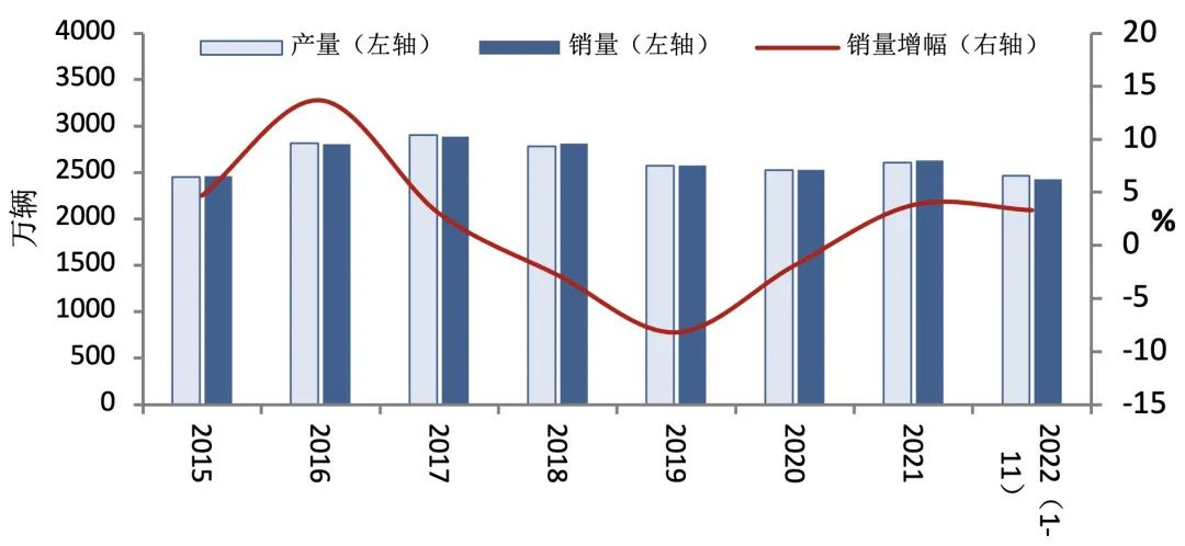 2022年1-11月,国产汽车产销量分别达到2462.8万辆和2430.2万辆,同比分别增长6.1%和3.3%(见图1)。二季度和四季度受疫情和消费大盘回落影响较大(见图2)。