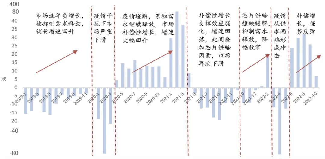 图6 近年汽车月销量增速变化及阶段性影响因素。