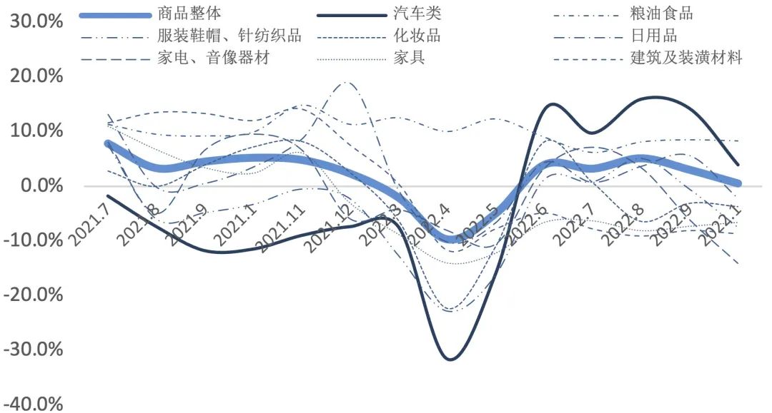 汽车类商品占社会消费品零售总额比重超过10%,既是居民消费的大件,也是消费大盘中的重头。在华东地区疫情有所缓解后,2022年下半年汽车消费不断发力,对稳定消费大盘的作用明显增强。1-10月全国社会消费品零售总额同比增长0.6%,而汽车类商品增长对社零总额增长的贡献率达到72.2%,较上年同期提高了62个百分点(见图3)。无论与商品消费整体还是与主要消费品类相比,汽车类商品都展现出较强增长动力(见图4)。