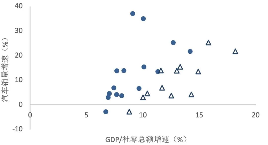 注:图中圆形为汽车年销量增速与当年GDP增速之间的相关性,三角形为汽车年销量增速与当年社零总额增速之间的相关性。数据中剔除个别受政策影响较大的年份。