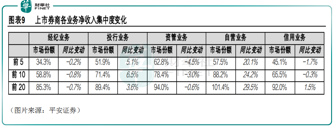 而自营收入出现分化加剧、集中度提升的特点;信用业务的集中度基本持平,CR10同比降0.3百分点至65.5%。
