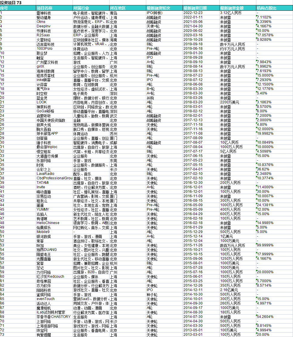 企查查的资料也显示了郑刚等投资人当下的焦虑,在紫辉创投历史投资的73个项目里,除去老生常谈的陌陌、映客、触宝,这家GP上一个结出来的IPO果实,还是2017年注资的雷神科技。