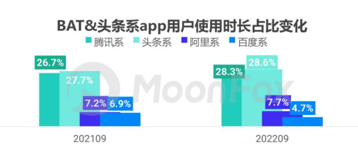 字节跳动批量化制造APP、孵化爆款的能力有目共睹,凭借今日头条、抖音、西瓜视频、皮皮虾、懂车帝、飞书等APP,头条系应用一直以来都抢占了最多的用户使用时长。根据月狐发布的行业报告,2022年三季度头条系APP用户时长在全网占比提升至28.6%,继续霸榜。应用数量方面,头条系APP相较上一年同期新增6个,新增数超过腾讯系、阿里系、百度系。
