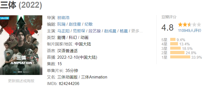 就在《中国奇谭》成为一匹黑马的同时,备受期待的“白马”动画《三体》陷入重重争议。从首日播放量破亿、豆瓣开分8.7分,到如今豆瓣分被11万人评出4.8分,这部历时五年打造的作品,给《三体》IP系列作品开了一发当头哑炮。