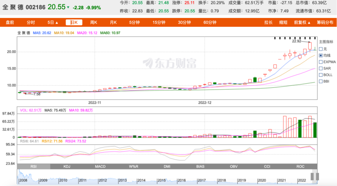 「子弹财观」查询东方财富网数据发现,全聚德自2022年12月14日股价出现当月第一次涨停,截至月底半个月时间里,全聚德股价收获7个涨停板。