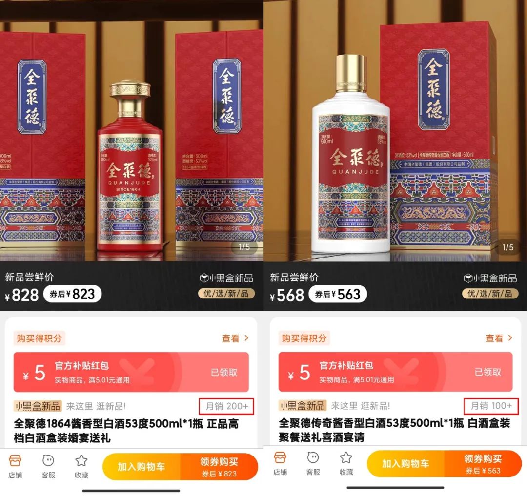 「子弹财观」在淘宝全聚德官方店铺内看到,售价828元/瓶的全聚德1864酱香型白酒月销仅200+,售价568元/瓶的全聚德传奇酱香型白酒月销仅100+。这样的销量却带来了超37亿元的市值,白酒概念的造富效应,可见一斑。