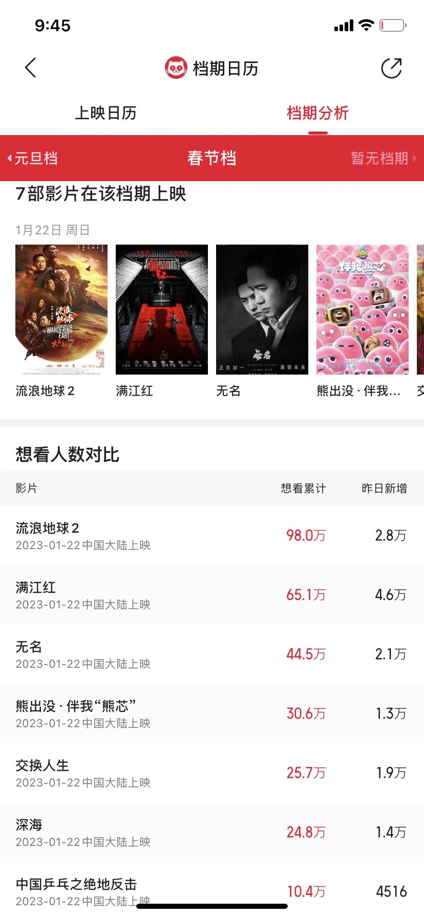 欢喜传媒出品,张艺谋继《狙击手》之后二闯春节档的《满江红》,因有顶流易烊千玺的加盟,阵容相当豪华,猫眼想看人数高至64万,女性观众占比高,为预期中的二号种子,目前存在着定位不清晰的问题。从相关剧情简介来看,与《悬崖之上》《影》等悬疑片有相似之处。雷佳音、岳云鹏、沈腾等喜剧演员的加入,为其贴上喜剧标签,近似于《三枪拍案惊奇》的古装+悬疑+喜剧定位,另外,张艺谋口碑通常较为过硬,但单片最高票房仅11.91亿,这些都为其带来了变数。