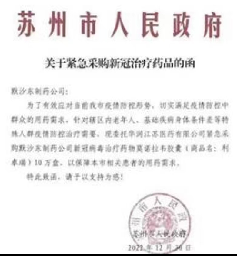 另获悉,包括苏州在内的多地政府已向默沙东发函,请求协助紧急采购莫诺拉韦胶囊。