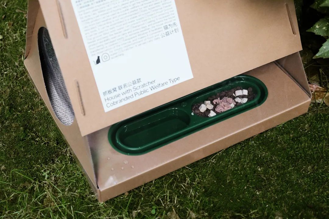 这次联名公益活动,还包括在户外放置pidan给流浪猫设计的户外补给站,内含窝体、抓板及内置双碗,并配合防虫设计,旨在为流浪的毛孩子提供应急用的生活用品。