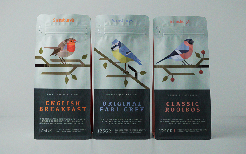 英国人爱茶,也爱小鸟。这款Sainsbury's森宝利茶,使用了清新自然的淡绿色为背景,上面用几何图形勾画了优雅的彩色鸟儿插画,让人看到这款早茶的包装,似乎就听到了清晨悦耳的鸟鸣声。