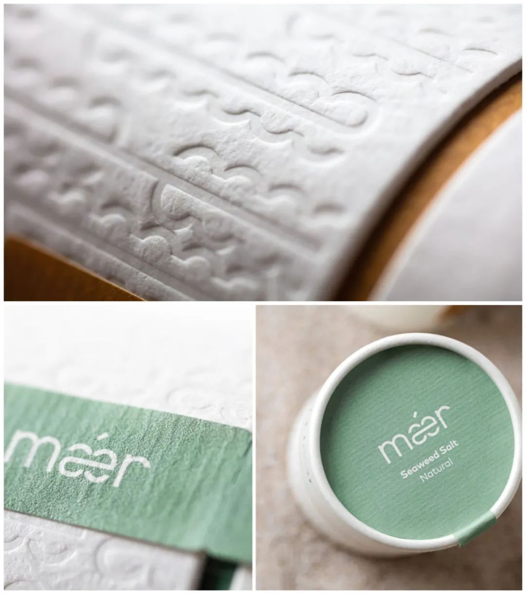 瓶身的标签纸也取材自有机海藻,以压印的形式绘出了海藻的花纹,体现了有机、自然、可持续的品牌理念。