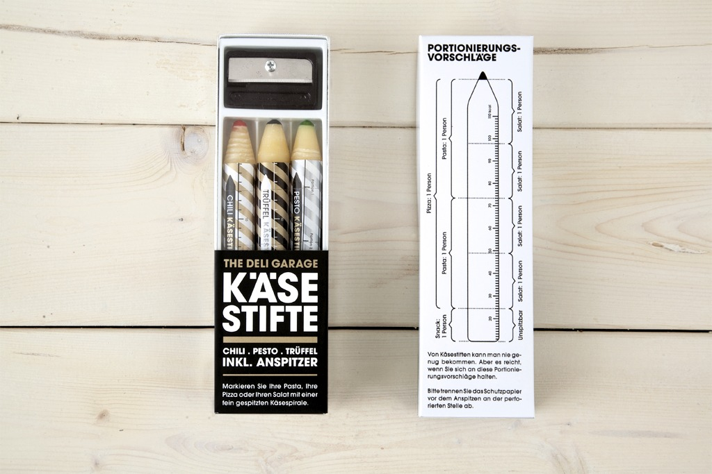 带着这个想法,The Deli Garage推出了红、黑、绿三色的创意奶酪笔套装,在笔芯位置,注入松露、辣椒或香蒜酱。整根奶酪笔,包括表面的金银清漆,都是完全可食用的。