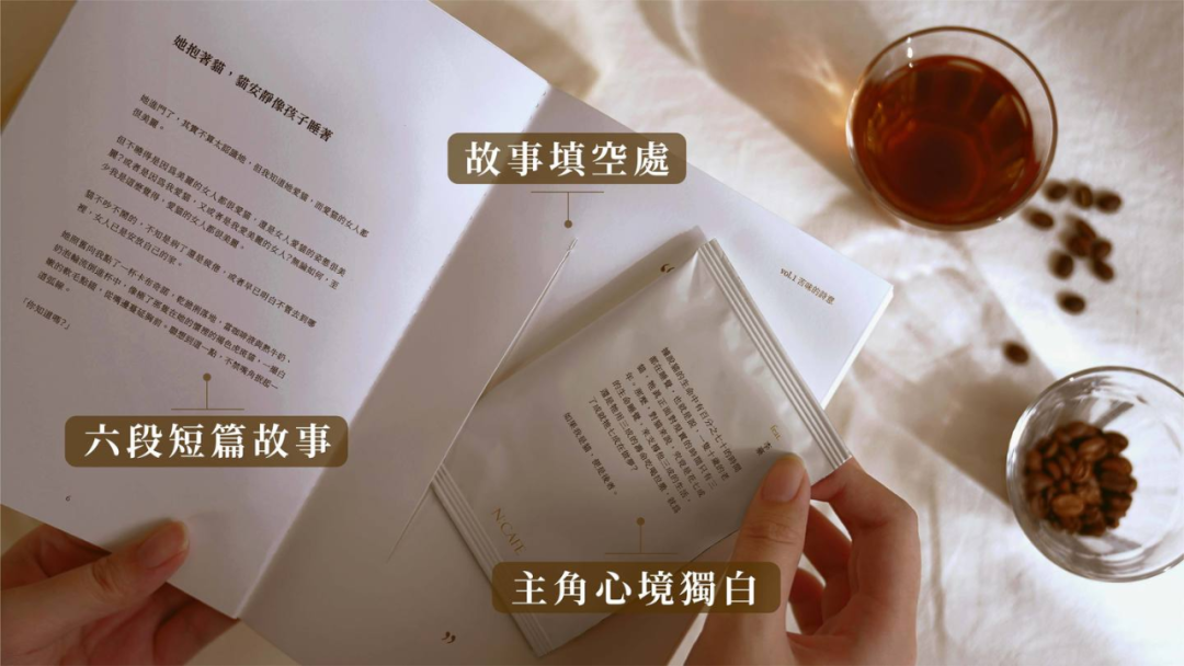 打开礼盒,内容物包括6个写着人生独白的咖啡包,以及一本由6个咖啡店里的人生故事构成的互动小说。每个咖啡包上都写有一段独白,读者可以根据自己的心境和理解,选择插入到故事中,从而编写出专属于自己的人生小说。根据独白的不同,咖啡的烘焙程度和风味也会发生变化,呼应故事的深层意味。