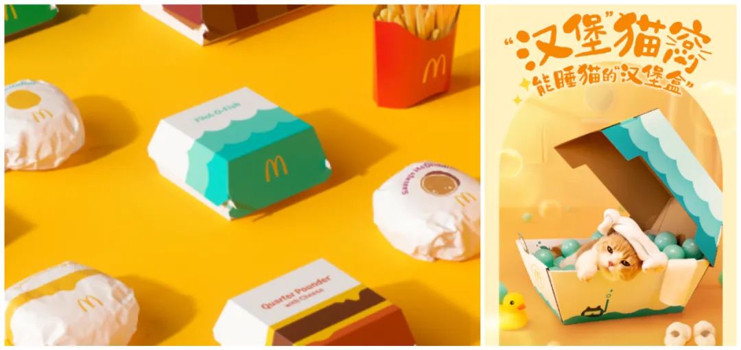 这款汉堡盒猫窝,是2021年12月麦当劳的一次冬季限定活动,使用了麦当劳在当年更换的全新视觉。在新视觉的图形基础上,设计师加入了小鱼、猫爪印等萌宠细节元素,最有趣的是,在汉堡盒上面开了个猫头形状的口,让这款汉堡盒猫窝的设计变得更加灵动可爱。