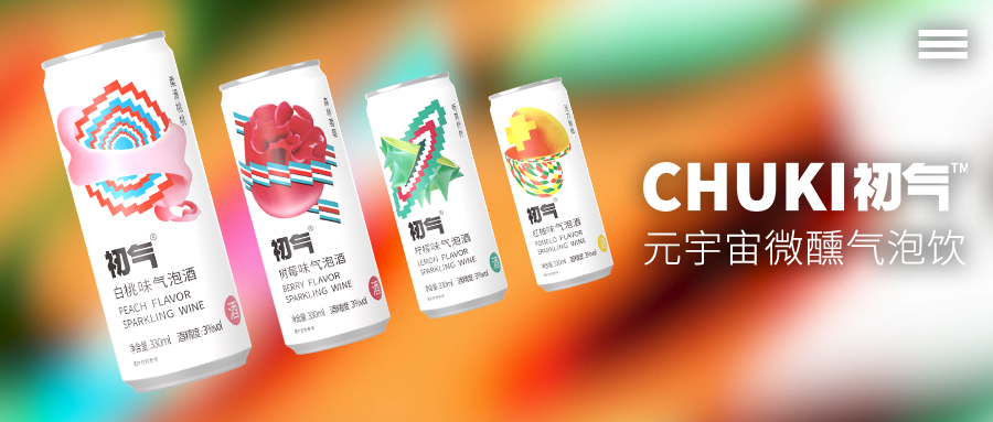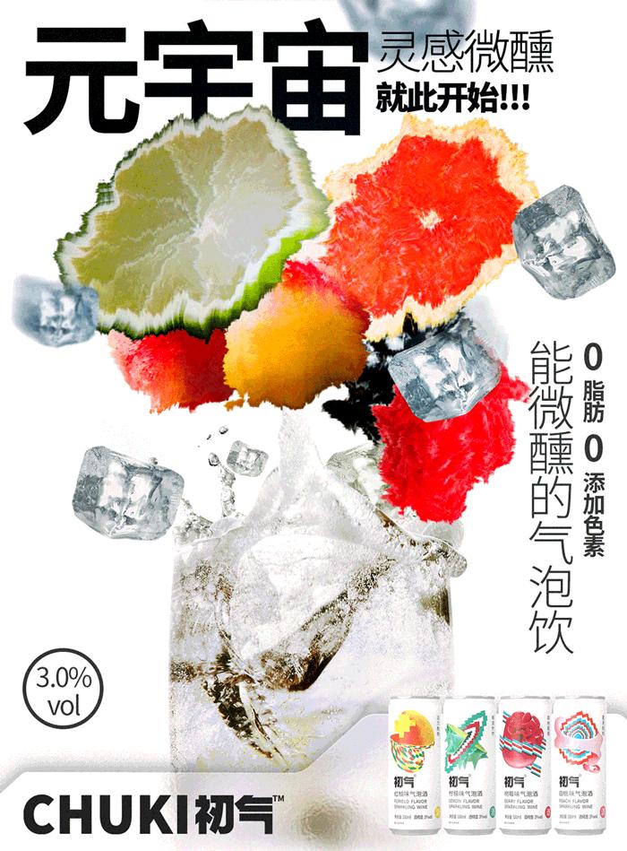 以中国白酒为基酒的微醺气泡酒品牌「初气」以灵感微醺为主题,推出了四款元宇宙未来风格的包装设计。