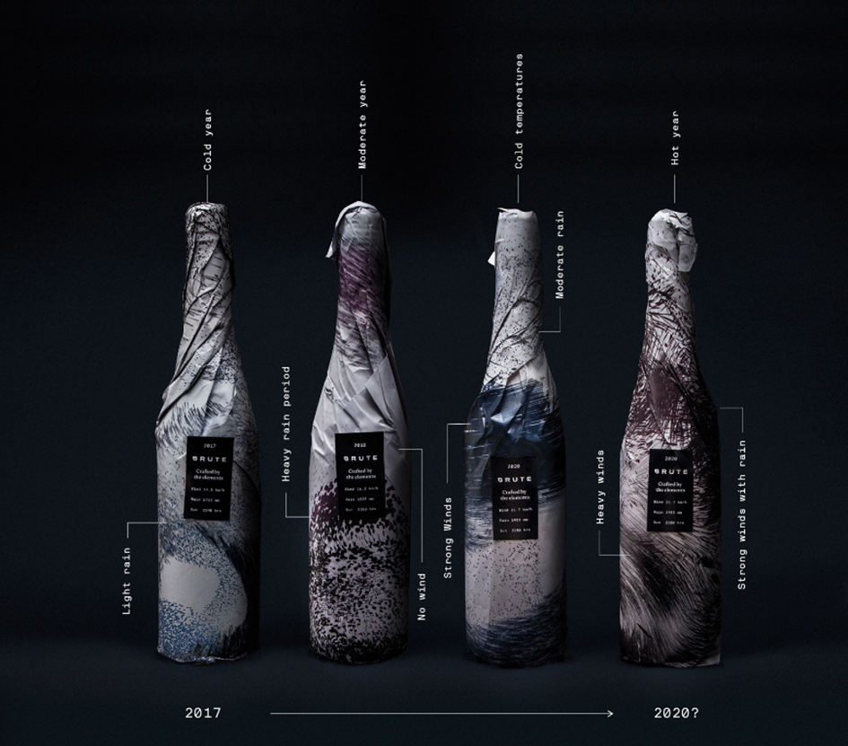 比如下面这款通过AI实时算法形成天气图谱的葡萄酒,就将这一特征设计为了独特的品牌印记。