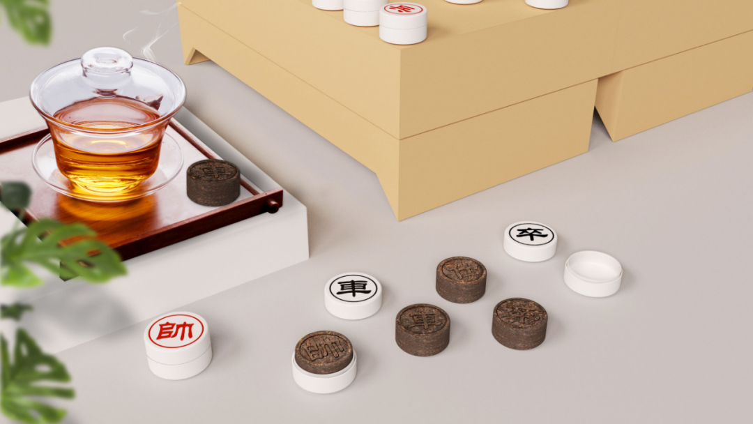 这款普洱茶包装创意性地将茶与中国象棋相结合,每一块迷你茶饼都是一颗象棋棋子,而且包装盒打开后,也可以快速组装成一个简易棋盘,让消费者在饮茶时可以下棋解压。在提供了休闲情绪价值的同时,也让包装二次利用,避免了材料浪费。