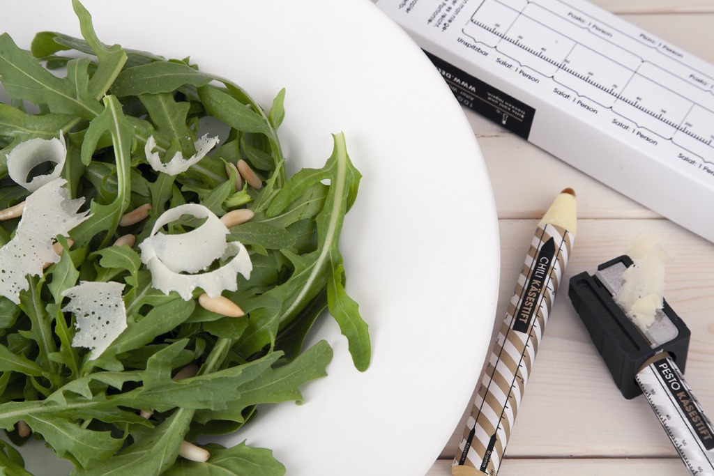 而奶酪笔的吃法,就像刨铅笔一样:用“刨笔刀”把奶酪笔的前端削尖,奶酪和中央注入的调味酱便会一卷一卷掉落下来,可以一起佐餐食用。