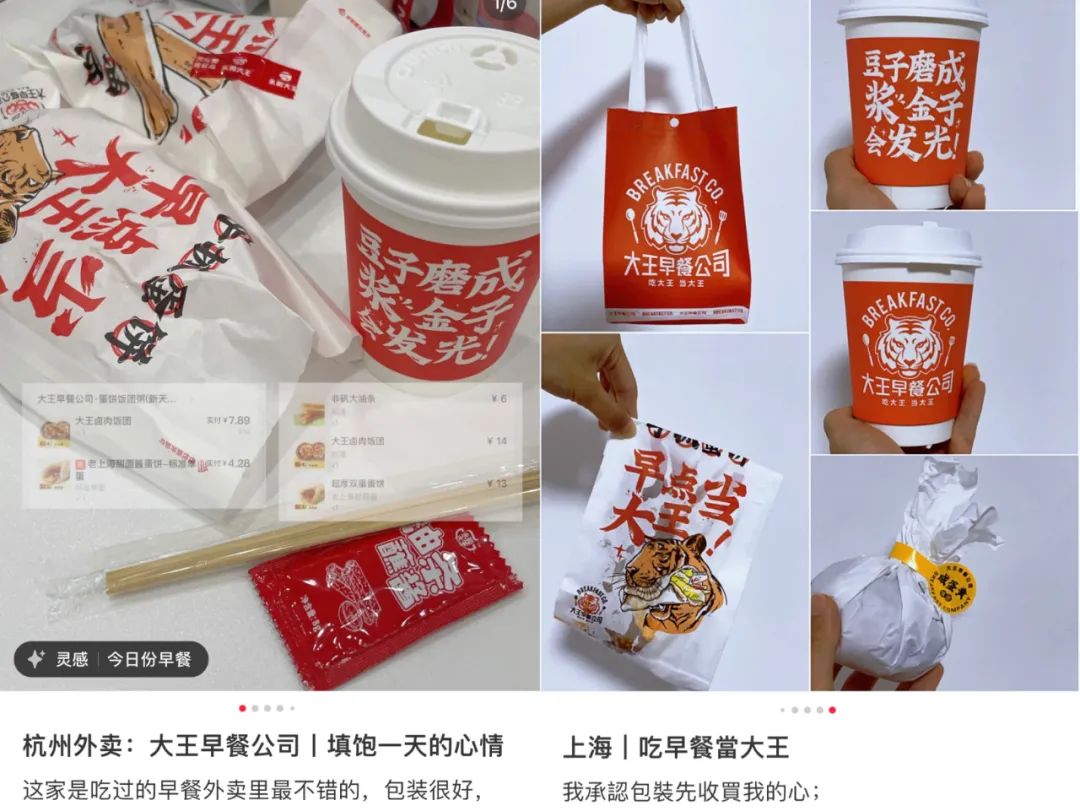 永和大王不仅将早餐时段售卖的油条、豆浆融入到全天的菜单中,与其他菜品补充呼应,还率先推出旗下首个全天候早餐品牌“大王早餐公司”。新品牌朗朗上口的宣传标语:“早点吃大王早点当大王”,比起“永和大王”更能打动当代年轻人。加之,大王早餐改用全新国潮风格的包装代替传统的塑料袋子,让每一位享用早餐的消费者眼前一亮,大大提升分享欲与仪式感。