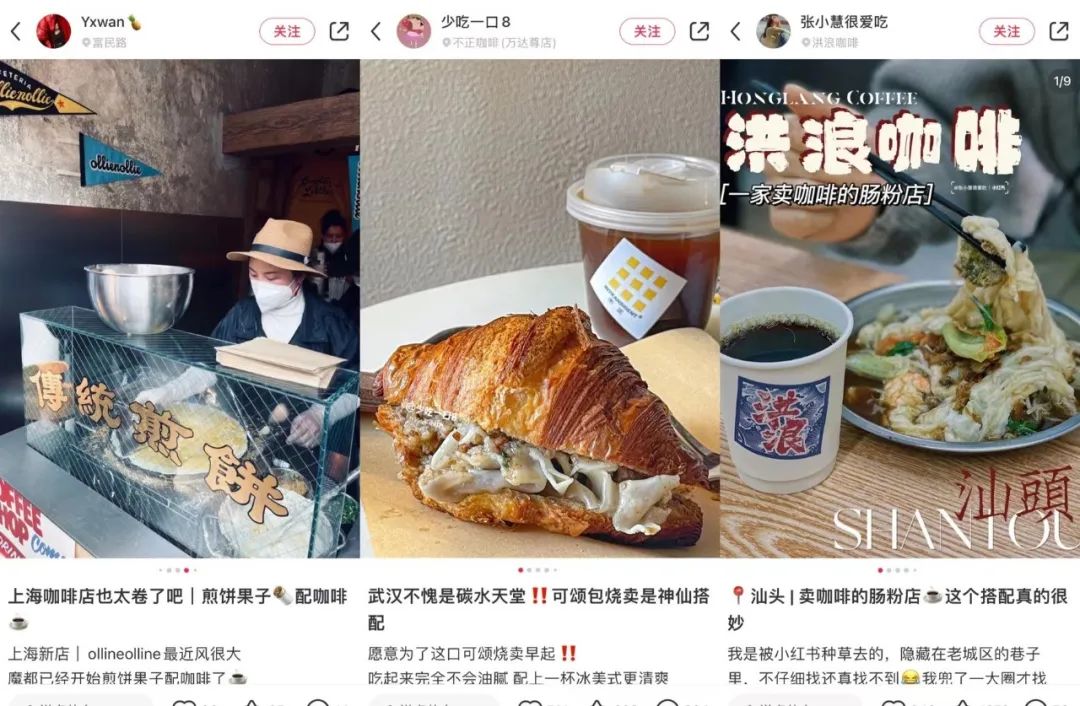 而在一些小众的地方咖啡馆也相继出现“咖啡+中式早餐”的营销,比如在去年4、5月份全网爆火、位于上海富民路的一家“煎饼果子咖啡店”ollie nollie store house,还有武汉卖“油颂包烧卖”的不正咖啡和汕头卖肠粉的洪浪咖啡,这些看似搭配得不伦不类的“咖啡+”却恰恰收获了很多年轻一族的喜爱。
