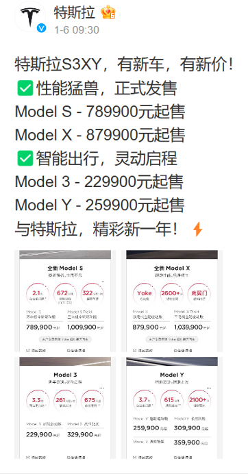 近日,特斯拉在官方微博及官网同时宣布,旗下两款主流车型Model 3起售价下调3.6万元至22.99万元,Model Y起售价下调2.9万元至25.99万元,降幅分别达到13.54%和10.04%,并一举创下这两款车型有史以来最低价。与此同时,特斯拉还一起官宣了两款高端车型Model S与Model X的起售价,分别为78.99万元与87.99万元。