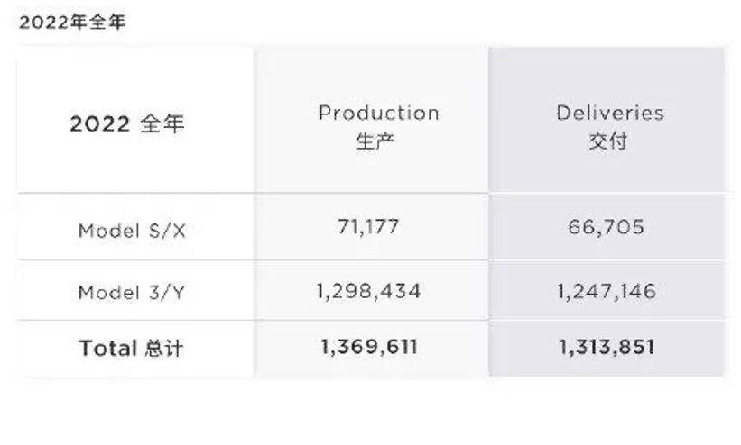 2022年,特斯拉的全球年产量约为137万辆,同比增长47%;全年交付量约为131万辆,同比增长40%。虽然产销量双双破百万,创下特斯拉历史最高纪录,却还是没有突破公司在年初制定的150万销量与50%增长的目标。