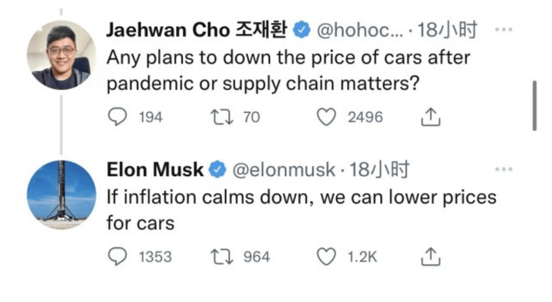 在说出这番话的半年前,对于特斯拉是否需要降价,马斯克或许还是犹豫的态度。去年7月15日,曾有一位Twitter用户在该平台上询问马斯克,在疫情与供应链问题解决后,特斯拉是否有降价计划?马斯克的回应是:“如果通胀降温,我们就能够降低汽车价格。”